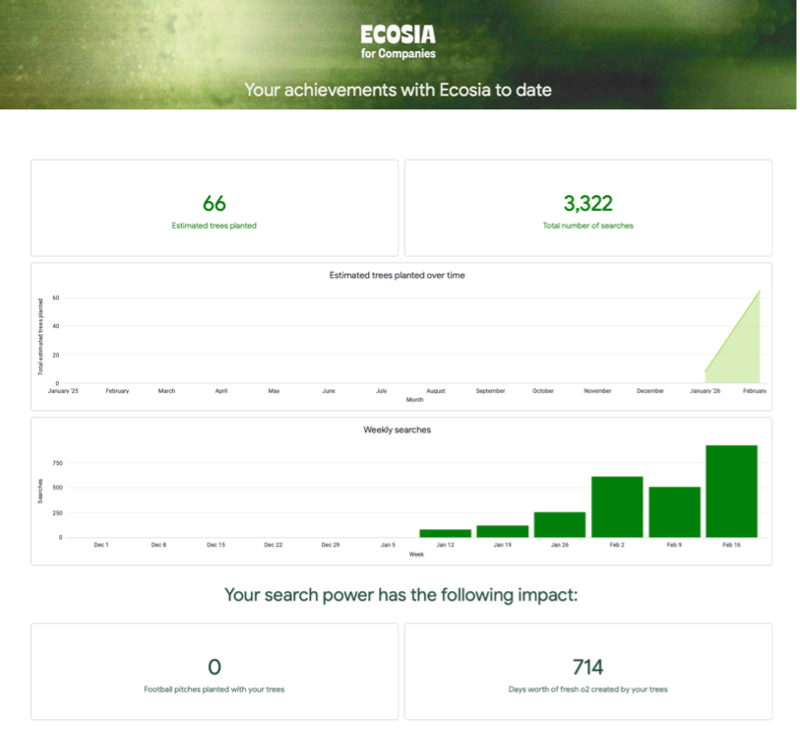 What is Ecosia Campus? Ecosia has started a project called Ecosia Campus. 40 schools around the world are already part of Ecosia Campus, and have made Ecosia their default search engine. This involves encouraging students and teachers to download the search engine, and installing Ecosia on a school's desktop computers, such as in the school library. But what makes an Ecosia Campus school official is the detailed tree reports. Ecosia Campus schools receive a unique link through which students and teachers download Ecosia. The unique link ensures that the right cookies are set, and you will thus contribute to the reports. The tree reports thus provide a product where the school's climate action can be seen. In this way, schools will receive reports on the number of trees planted as a result of their searches. Using Ecosia's online impact calculator, we can estimate that BG could plant 11,520 trees and bind 144 tons of CO2 after just one year, if 1,200 people participate.